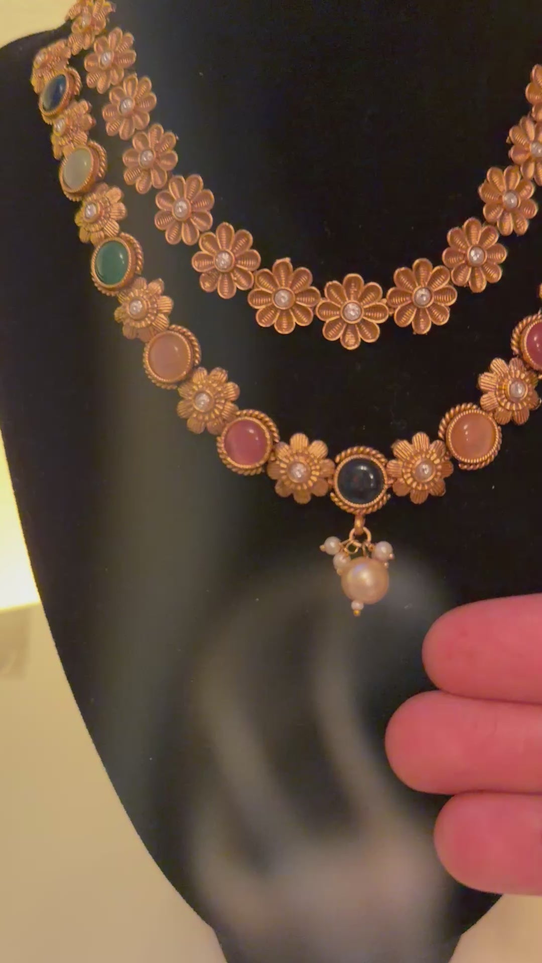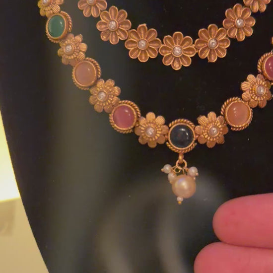 A beautifully crafted antique-finish necklace set inspired by traditional floral artistry. Featuring delicate flower motifs paired with multi-tone stone detailing, this piece is finished with elegant pearl drops for a timeless, regal look.