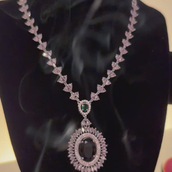 Make a statement with timeless elegance. This stunning emerald halo necklace set features a bold oval centrepiece surrounded by a radiant halo of high-shine stones, paired with matching earrings for a complete, graceful look.